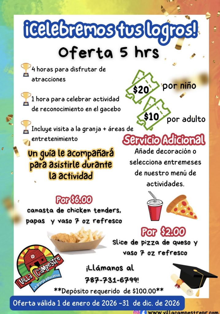 Contáctanos para apoyarte en la coordinación de tu evento. Con nuestra oferta de 5 horas tendrás espacio para el disfrute en la granja y atracciones por 4 horas y luego una hora completa para la ceremonia o colación de grados.